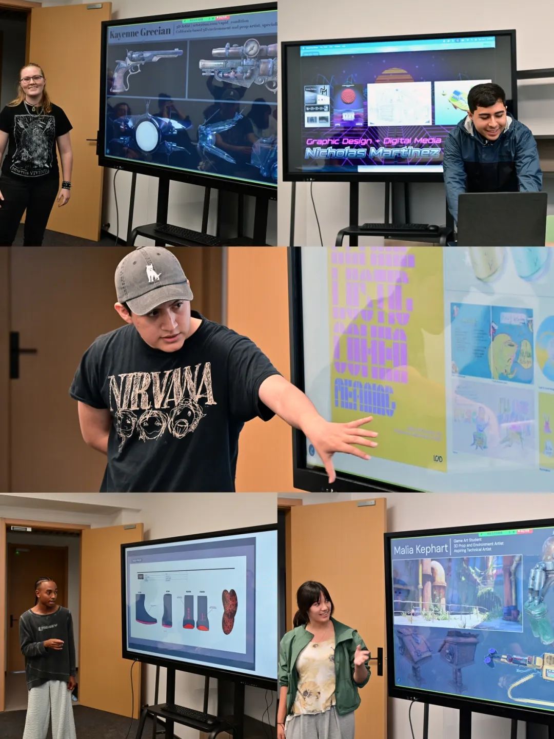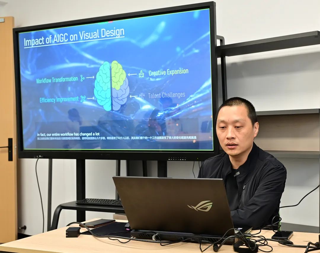 随后,中美员工进行了经验分享环节。员工们纷纷展示自己在不同领域的研究成果及代表作品。美方员工展示了他们在模型设计、特效等领域的作品,介绍了对新兴技术的探索与应用。中国员工着重讲述了使用AI 工具的经验,分享了如何借助 AI 提升创作效率、激发创意灵感等实用技巧。