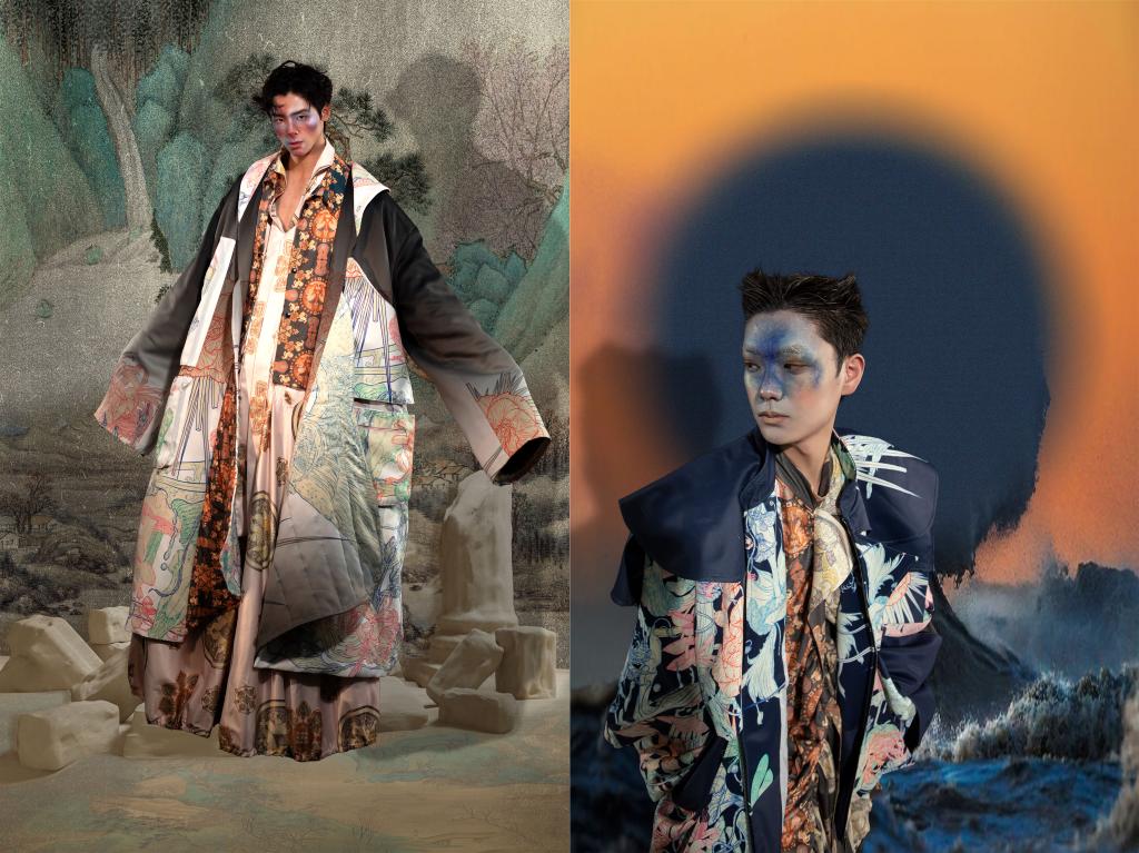 设计风格定位是基于有翼对兽纹样研究背景下的时装设计,本系列为男装系列创意设计。通过对传统图案的运用和现代时尚款式结合的运用。提取织物中有翼对兽纹和配伍纹样的代表性元素,进行重新组合设计,辅以时尚流行色彩,有机结合到现代款式中去