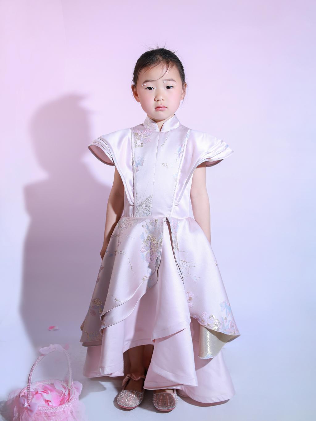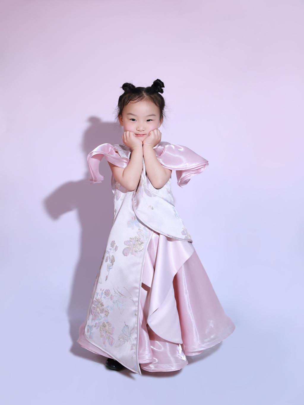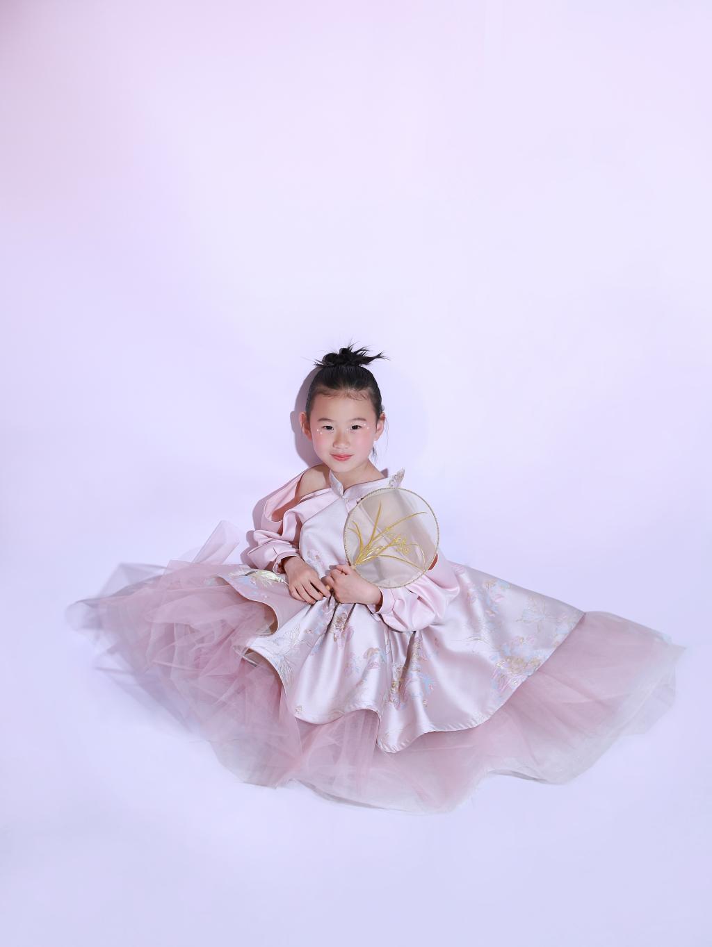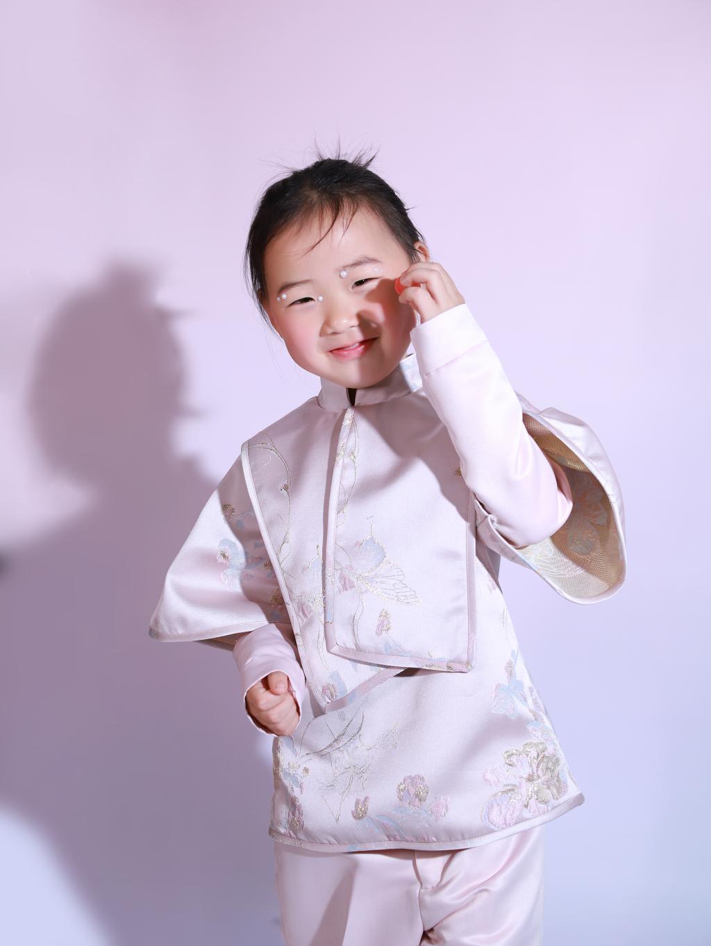 本系列花童礼服设计主题为《听荷入烟雨》,荷花是传统服饰中的典型装饰元素,常与莲蓬、童子组合出现,寓意多子多福。本系列设计提取传统服饰衣领、门襟等局部造型与西式礼服裙进行搭配,裙摆结合荷花、荷叶造型,象征神圣纯净,寓意着纯真的爱情,从荷花中提取饱和度较低的粉色为主体用色,营造素雅清新的设计风格。