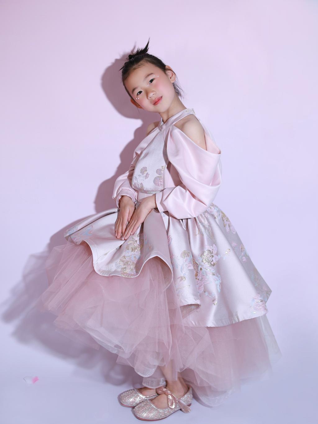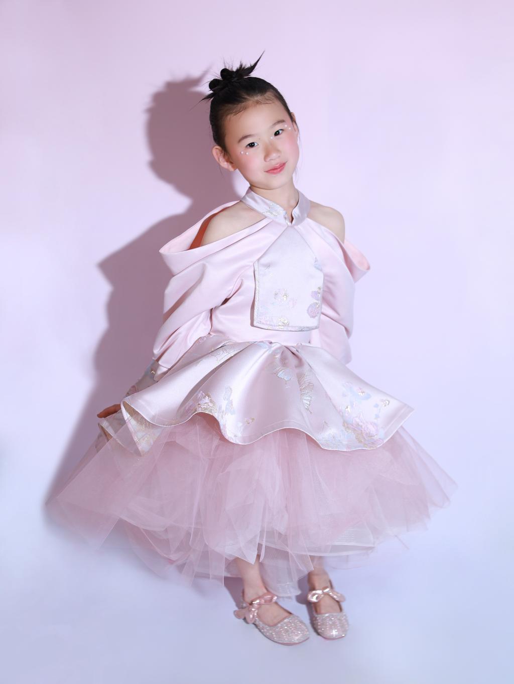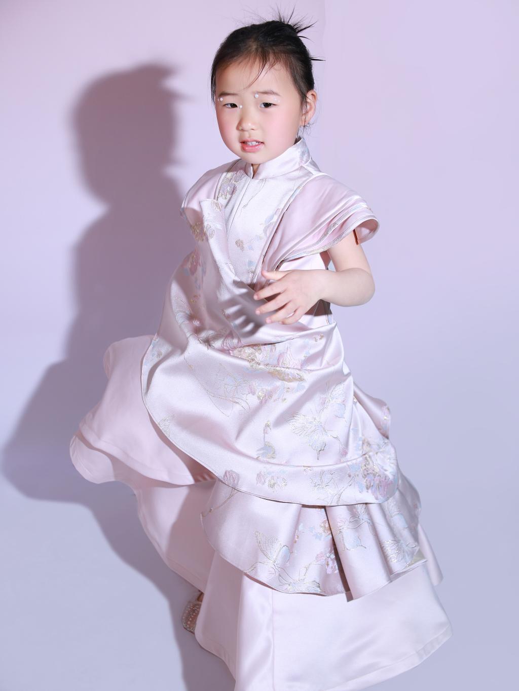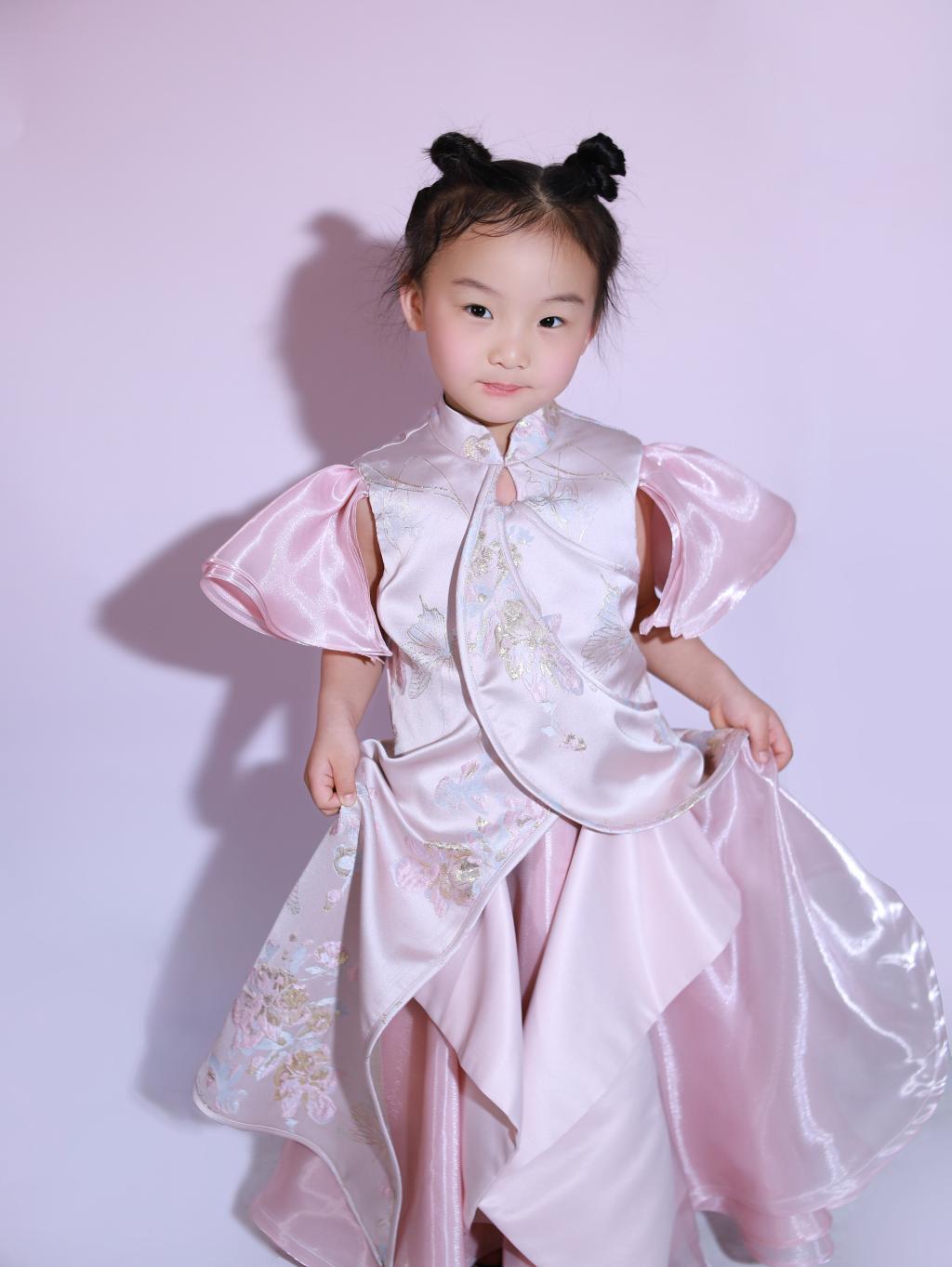 本系列花童礼服设计主题为《听荷入烟雨》,荷花是传统服饰中的典型装饰元素,常与莲蓬、童子组合出现,寓意多子多福。本系列设计提取传统服饰衣领、门襟等局部造型与西式礼服裙进行搭配,裙摆结合荷花、荷叶造型,象征神圣纯净,寓意着纯真的爱情,从荷花中提取饱和度较低的粉色为主体用色,营造素雅清新的设计风格。