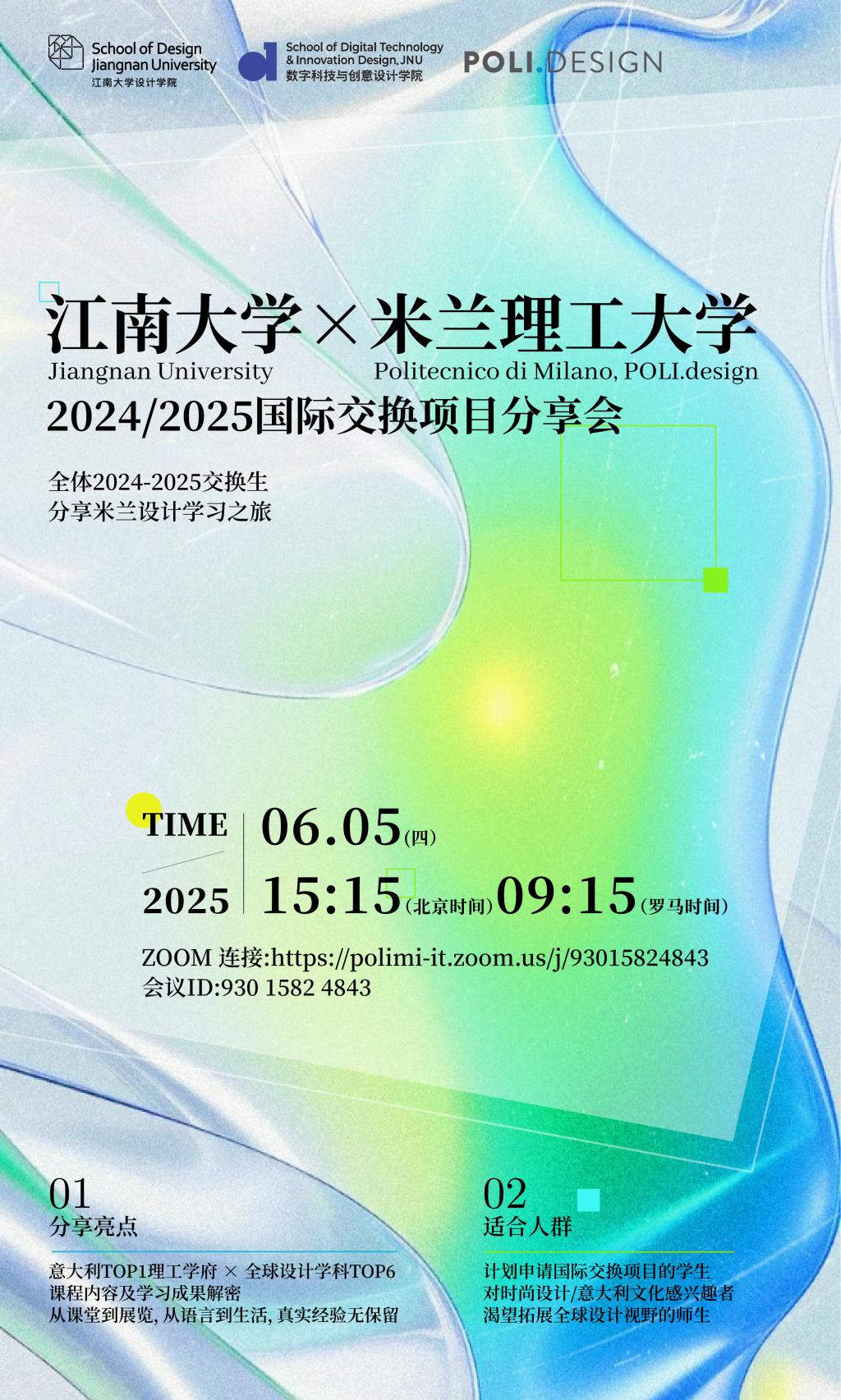 The Fashion System International Exchange Program, jointly organized by the School of Design at Jiangnan University and POLI.design School of Design at Politecnico di Milano, has successfully run for multiple editions. On Thursday, June 5th, 2025, at 15:15 Beijing Time,sevenstudents from the 2024-2025 academic year exchange program will share their cross-cultural learning experiences in Milan, covering course practices, industry insights, and cultural explorations, providing valuable references for faculty and students interested in international exchanges.
